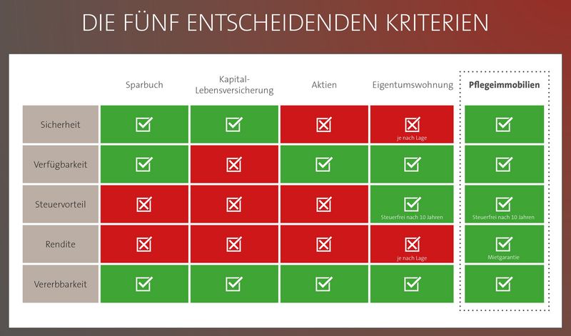 Die Investition in eine Pflegeimmobilie bietet in Zeiten des demographischen Wandels herausragende Vorteile. Nutzen Sie diese gezielt für Ihre Altersvorsorge oder zum Vermögensaufbau. Als Alternative zur Rentenversicherung, Fonds oder anderen Niedrigzinsanlagen bringt Ihnen die Pflegeimmobilie höhere Erträge bei gleichzeitiger Sicherheit.